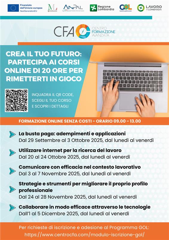 Corsi GOL- CFA DATE: vari corsi GOL da settembre a dicembre 2025 DURATA: 20 ore SEDE: FAD (formazione a distanza) Locandina CFA GOL (png - 88 KB)