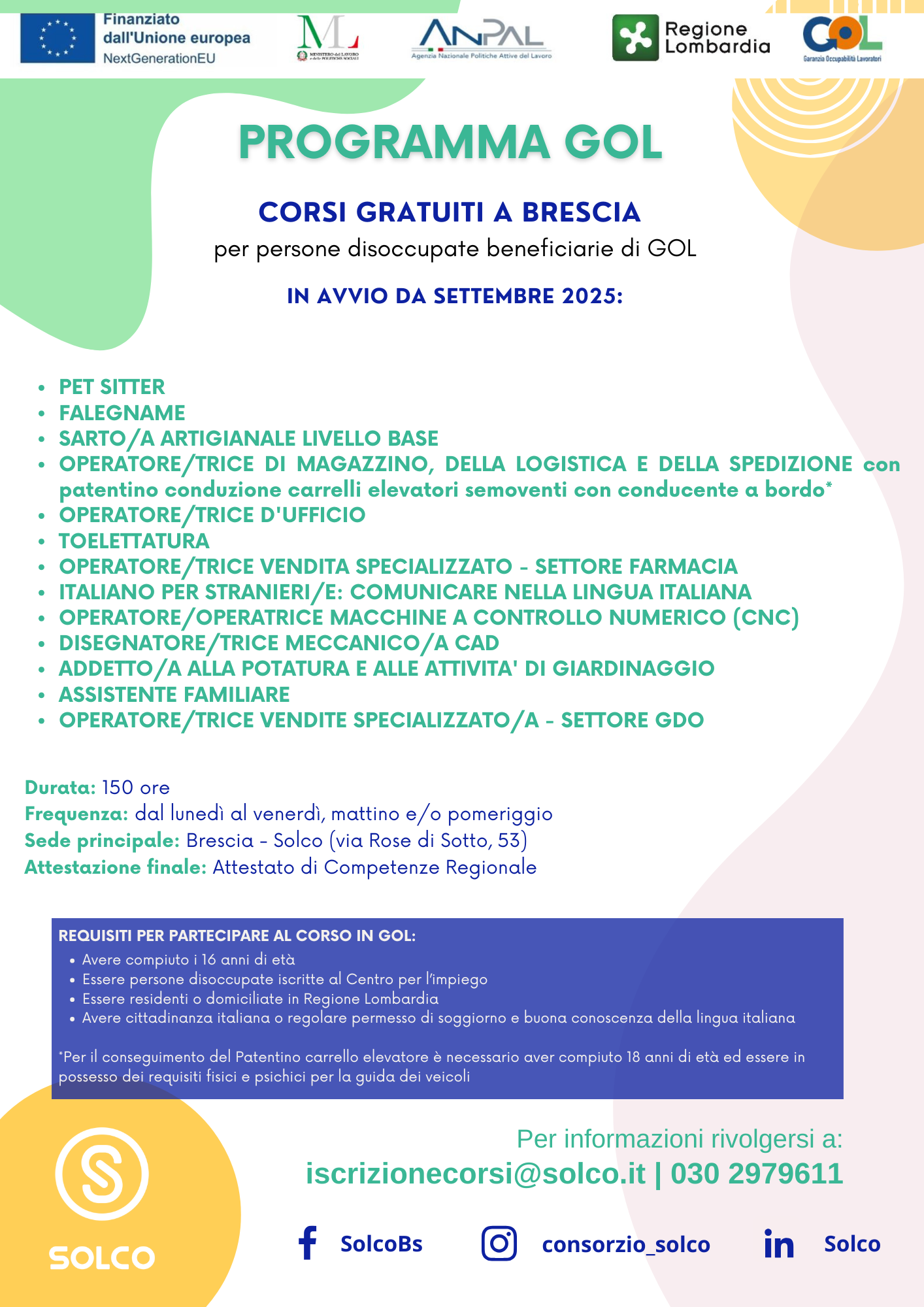 Sono in partenza nuovi corsi GOL nel mese di settembre presso la sede Solco di Brescia.