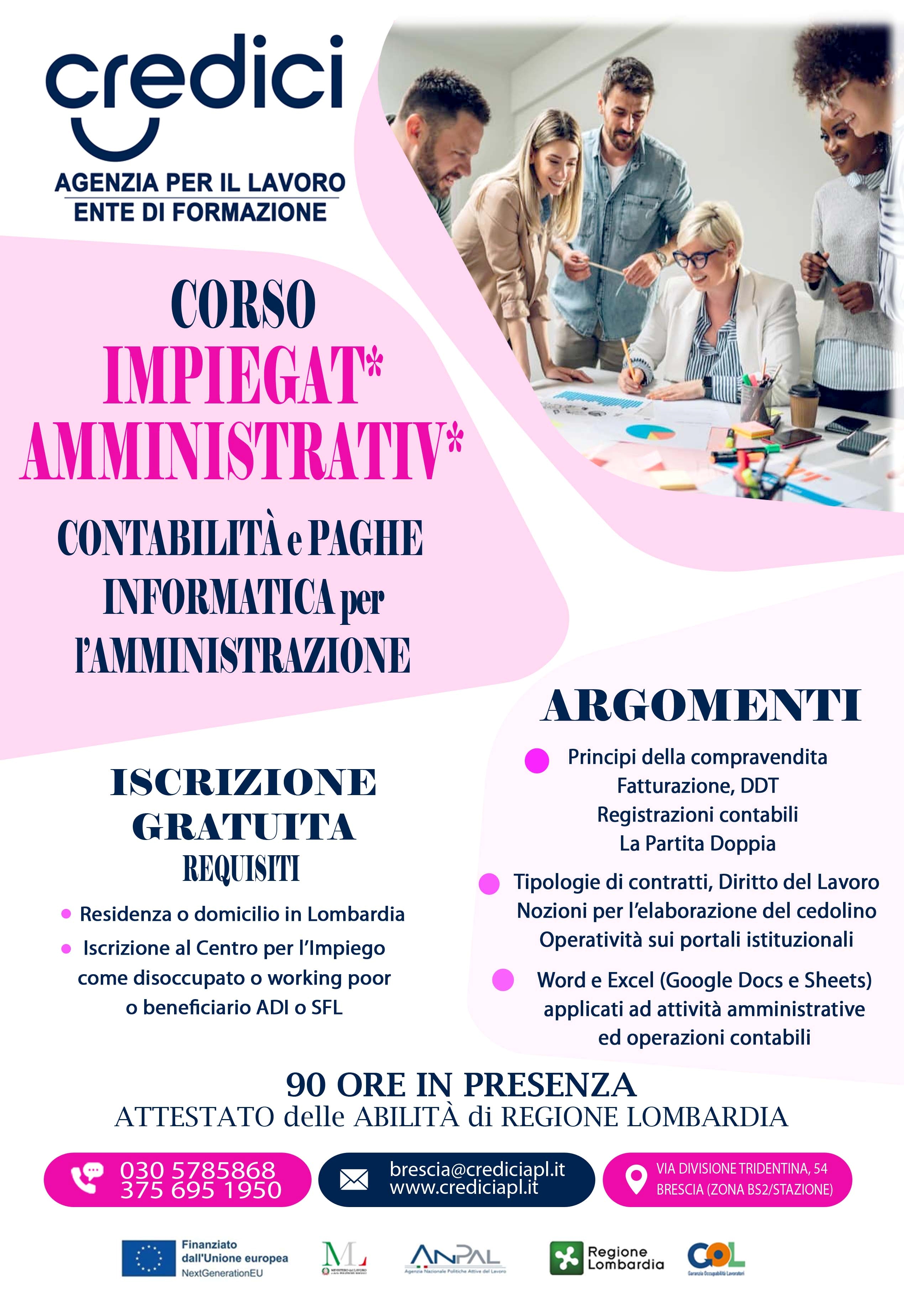 Iscrizione: Per info approfondite sui calendari, gli argomenti, la sede, telefona o scrivi al nr. 375 695 1950 o al nr. 030 5785868, oppure invia una e-mail a brescia@crediciapl.it con i tuoi dati e il nr. di telefono per essere ricontattato.
